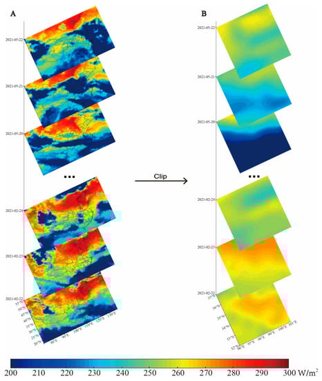 (A) OLR values at the China scale 90 days before the Madoi earthquake (22 February 2021–22 May 2021). (B) OLR values within the 5° × 5° spatial extent of the epicenter of the Madoi earthquake cropped out from A.