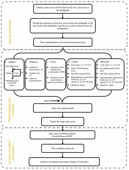 Based on the OLR data, a time series prediction model was selected to predict the OLR values in the pre-earthquake epicenter’s 5° × 5° spatial range. After preprocessing the OLR data, the training and selection of the model was the key to obtaining the subsequent analysis data, and it was also the core of the whole experiment. The trained model was used to predict the OLR values for ninety days when there was no earthquake and ninety days before the earthquake, respectively, and the similarity test was performed with the actual values to detect whether there was any anomalous period before the earthquake. Finally, 95% confidence intervals were set to extract and analyze the temporal and spatial characteristics of the anomalies to detect the possible precursor information of earthquakes. Figure 3 shows the whole process of the experiment.