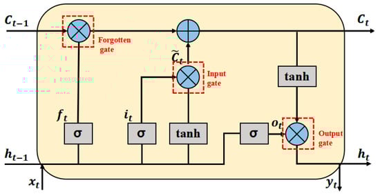LSTM is a popular RNN structure that can learn long-term dependent information []. The LSTM network generally consists of three gate units (forgotten gate , input gate , and output gate ) and a memory cell (Figure 4). The forgetting gate is responsible for receiving the output from the hidden layer at the previous time, the newly input, and determining the information to be forgotten, the input gate is responsible for controlling the update and storage of the information, the output gate determines the information to be output in the current state, and the memory cell controls the transmission of the information.