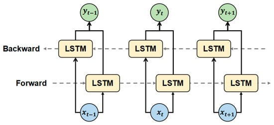 Based on LSTM, BILSTM combines the information of the input sequence in both forward and backward directions. For the output at time t, the forward LSTM layer has information for time t and before in the input sequence, and the backward LSTM layer has information for time t and after in the input sequence (Figure 5) []. The vectors output by the two LSTM layers can be added, averaged, or concatenated.