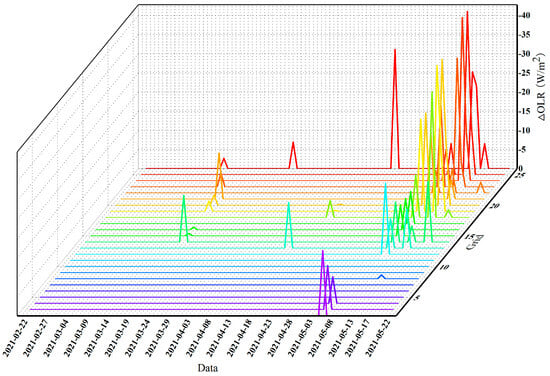 OLR anomaly prediction before the Madoi earthquake—temporal scale. The anomalies in different grids are represented by different colors.