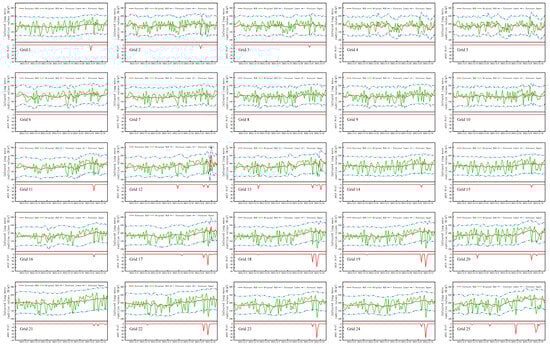 The results of the ED values between the actual and predicted time series of OLR for the 25 grids around the epicenter for the 90 days when there was no earthquake and the 90 days before the earthquake are shown in Table 2. As shown in Table 2, the ED values for the 25 grids when there was no earthquake were all lower than those of the pre-earthquake ED values. The two sets of results were processed as differences to visualize the similarity between the two sets of time series and explore the possible regional range of anomalies. The results show that the difference in ED was more significant in the east (grids 14 and 15) and south (grids 17–25) of the epicenter and smaller in the west (grids 11 and 12) and north (grids 1 and 3–12) of the epicenter. The results of the ED comparison reflect abnormal changes in the actual time series before the earthquake. At the same time, the more significant differences in the eastern and southern parts of the epicenter indicate that anomalies were more likely to occur in this region.