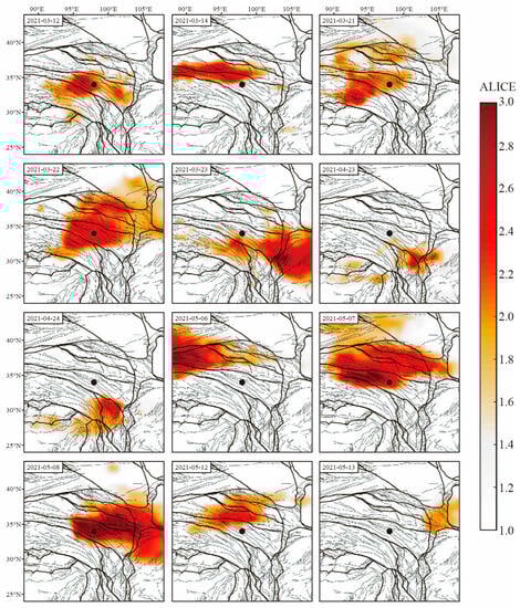 The ALICE method was employed to select a research area encompassing a 10° × 10° region with the epicenter of the Madoi earthquake at its center. The chosen time frame spanned the 90 days preceding the earthquake, aligning with the time window used in the LSTM method for predicting preseismic anomalies. This approach was adopted to acquire insights into the evolution of OLR anomalies leading up to the Madoi earthquake, subsequently generating spatial distribution maps of OLR anomalies (Figure 8). According to a previous study, an ALICE value greater than 2 was considered to fall within the category of anomalies [].