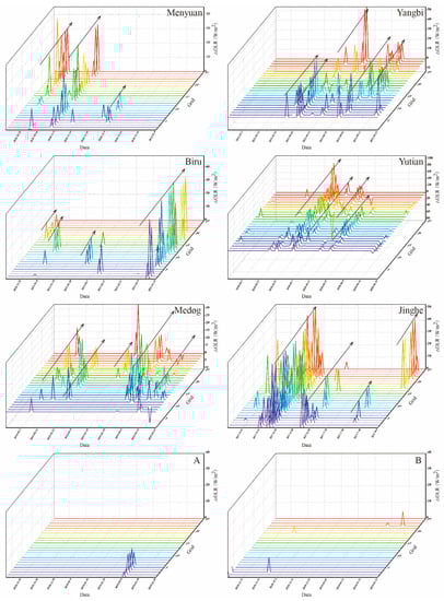 The following information can be obtained from Figure 9: Before the Menyuan earthquake, six anomalies were observed. The first anomaly occurred on the 79th day before the earthquake; then, there were two centralized anomalies occurring on the 80th day and the 54th day before the earthquake, and the last anomaly centrally appeared on the 32nd day before the earthquake and then tended to be calm until the earthquake occurred. There were eight days of anomalies before the Yangbi earthquake, with the earliest anomaly occurring on the 60th day before the earthquake and the last anomaly occurring on the 9th day before the earthquake, and almost every anomaly appeared on multiple grids at the same time. There were also eight days of anomalies before the Biru earthquake, with the earliest anomaly occurring on the 85th day before the earthquake, the last anomaly occurring on the 5th day before the earthquake, and anomalies occurring on 13 grids at the same time. For the Yutian earthquake, anomalies first appeared 87 days before and continued until the 2nd day before, totaling 22 days with anomalies. On the 50th day before, 18 grid cells exhibited anomalies simultaneously; at other times, anomalies were mostly concentrated in multiple grid cells. There were 14 days of anomalies before the Medog earthquake, with the first anomaly occurring on the 84th day before the earthquake and the last anomaly occurring on the 2nd day before the earthquake. The fluctuation in anomalies before the earthquake was obvious, with concentrated anomalies occurring for many days. The earliest anomaly of the Jinghe earthquake occurred on the 82nd day before the earthquake, and several strong and concentrated anomalies appeared from the 80th to the 70th day before the earthquake, with the earthquake occurring on the 4th day after the last concentrated anomaly ended.