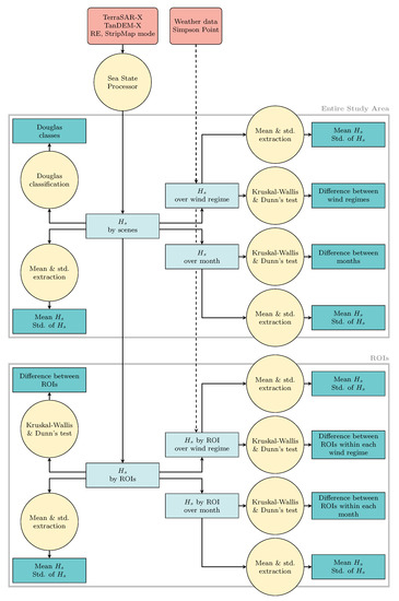 Throughout the data stack, the values within each ROI were averaged per scene. In the next step, the averaged values were summed up and divided by the total number of scenes. The resulting mean significant wave heights per ROI were compared using the Kruskal–Wallis and Dunn’s tests. Each ROI was treated as one group resulting in 7 groups of 175 measurements (total number of scenes). A similar procedure was used for the variable analysis. In this case, the Kruskal–Wallis and Dunn’s tests were applied to the ROIs within each class rather than between the variables.