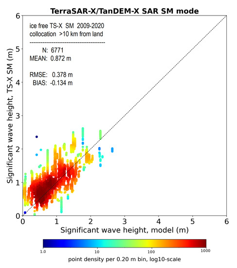 The comparisons are shown in the scatter plot in Figure 5. As the TS-X/TD-X scenes were processed with a grid step of 600 m, a set of TS-X/TD-X values corresponds to a value of the coarse model. Therefore, the vertical distribution of the wave heights represents the local variability in the sea state.