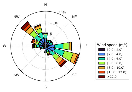 Wind data from the weather station on HIQ located at Simpson Point were collected from the climate archive of Environment and Climate Change Canada [71]. The wind speed and wind direction are recorded hourly. The station was installed in 1994 [43], but there have been a few occasions when the station has failed due to weather or wildlife interference. The wind rose in Figure 6 shows the two dominant wind regimes, i.e., NW and ESE, as recorded in the literature [43,44,45]. The wind data were used to aggregate the -scenes according to the dominant wind regime.