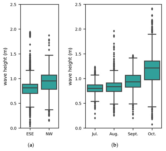 The mean over the whole study area by the wind regime shows generally higher waves in the NW regime with 0.92 m. The ESE regime is characterised by lower waves with 0.81 m. The standard deviation reveals higher variations under the ESE conditions with 0.32 m, while the NW regime shows less variations with 0.29 m. Also, the comparison of the dominant wind regimes with the Dunn’s test shows significant differences as indicated by the box-plot in Figure 10a. The NW conditions result in a wider range of values, while the ESE conditions produce more outliers.