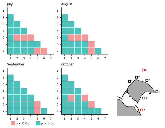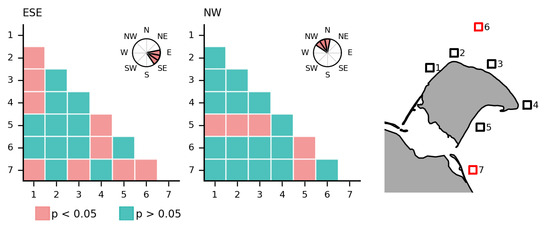 Figure 11 shows the result of the post hoc test. The most significant differences are found in the ESE conditions. Here, ROI 1 on the western side of HIQ is significantly different from almost all the other ROIs, except ROI 6 further offshore and ROI 5 in Thetis Bay. Also, around Collinson Head, ROI 4 shows significant differences from ROI 1, ROI 5 and ROI 6. In contrast, under the NW regime, only ROI 5 shows significant differences to any other ROI, except ROI 4. The ROIs north of the island (ROI 2, ROI 3 and ROI 6) show no significant differences under either dominant regime.