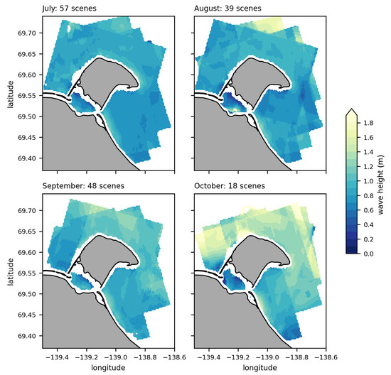 Significant wave heights in the Beaufort Sea are limited by wind speed and fetch length [17,18]. Therefore, the highest waves occur during the open-water season. This usually starts at the end of June and ends in October, when the fetch can be longer than 1000 km [23]. In general, extreme wave heights in the Beaufort Sea can reach 4 m during storm events [17,56,57]. However, the average wave height is less than 0.8 m high and rarely exceeds 1.20 m [58].