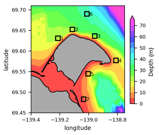 The focus of this study is the Arctic nearshore waters around HIQ at 69.59°N, 139.09°W. HIQ was chosen because of the wealth of ancillary data available to link wave mapping to environmental variables. Previous studies have already linked the highly eroding coast to changes in storm patterns, sea ice coverage and nearshore sediment pathways (e.g., [22,23,43,44,45,46,47]). However, knowledge of the spatial wave climate is crucial to explain the observed erosion rates. Furthermore, HIQ is of high cultural value to the Inuvialuit and is on the tentative list of UNESCO World Heritage Sites submitted by Canada [48]. Coastal erosion poses a threat to this heritage, and one archaeological site has already been lost while other seasonally used buildings needed to be relocated [49]. Knowledge of changing wave patterns and their implications is therefore of great interest to HIQ.