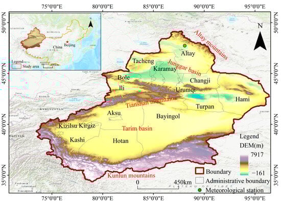 Xinjiang, located in the northwest region of China, exhibits a temperate continental arid climate, as illustrated in Figure 1. The region boasts a complex and diverse geomorphology, featuring a sequence of distinct geographical formations from north to south, including the Altai Mountains, the Junggar Basin, the Tianshan Mountains, the Tarim Basin, and the Kunlun Mountains. This distinctive topographical arrangement, often referred to as the ‘three mountains sandwiching two basins’, gives rise to a wide range of climates, vegetation types, and other natural characteristics [37]. The predominant vegetation types in Xinjiang consist of meadows and steppes. In the arid southern regions of Xinjiang, desert landscapes are primarily covered by drought-resistant shrubs, while the northern Tianshan Mountains region is characterized by forested and meadow areas, predominantly featuring evergreen coniferous forests and alpine meadows [38]. The soil types in northern Xinjiang are predominantly composed of Caliche soil and Aridisol. Saline soil is commonly found along the margins of the Tarim Basin, while alpine soil prevails in the mountainous regions. Areas with high Normalized Difference Vegetation Index values are notably located in the Tianshan and Altay mountains of northern Xinjiang, as well as in the peripheral regions of the Tarim Basin in southern Xinjiang. Furthermore, the geographical distance of Xinjiang from the ocean results in limited moisture transport, due to the obstructing influences of the Tibetan Plateau and the Tianshan Mountains, ultimately contributing to scarce precipitation in the region [39]. Over the period from 1960 to 2021, the average annual temperature in Xinjiang ranged from −20 °C to 17 °C, with an average annual precipitation level of 156 mm. Precipitation in northern Xinjiang generally surpasses that in the southern region, and mountainous areas receive greater amounts of precipitation compared to the basin areas [40,41,42].