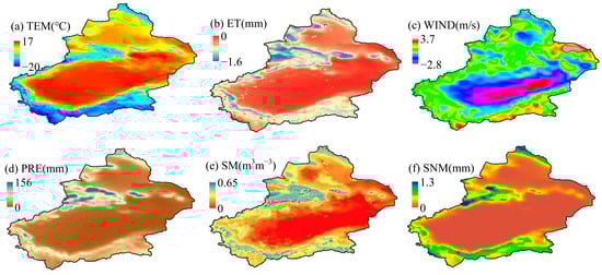 The spatial distribution of (a) temperature (TEM), (b) total evapotranspiration (ET), (c) wind speed (WIN), (d) precipitation (PRE), (e) soil moisture (SM), and (f) snowmelt (SNM).