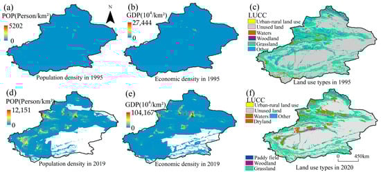 Spatial distribution of (a,d) population density (POP), (b,e) economic density (GDP), and (c,f) land use types (LUCC).