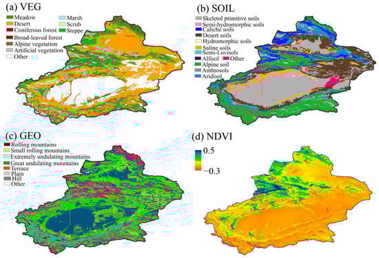 The spatial distribution of (a) vegetation type (VEG), (b) soil type (SOIL), (c) topography type (GEO), and (d) normalized difference vegetation index (NDVI).