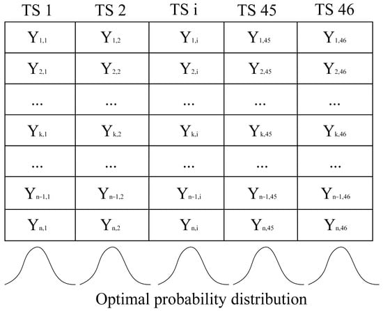 Soil moisture exhibits notable regional variations and seasonal fluctuations, which poses challenges when utilizing it directly for extensive, long-term drought analyses [14]. To address this challenge, this paper chose to divide each year into 46 distinct time intervals, using an 8-day time scale after excluding 29th February during leap years. The last time interval, denoted as 46TS, represented the mean of the last 5 days of each year. The calculation of soil moisture percentiles was executed by fitting an optimal probability distribution function, as illustrated in Figure 5. Subsequently, these derived probabilities were applied to the original time series and then aggregated to create annual datasets. This consolidated dataset was then employed to identify instances of both flash drought and traditional drought.