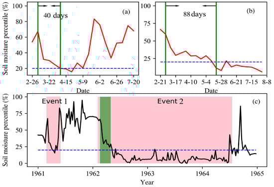 The duration of the intensification period served as a criterion to distinguish between flash drought and traditional drought. Specifically, when the intensification period lasted less than 8 TS, it was categorized as a flash drought event; when it exceeded 8 TS, it was classified as a traditional drought event. These distinctions are visually depicted in Figure 6, where Event 1 represents a flash drought event, reducing the soil moisture percentile from 67% to 20% over a span of 40 days (equivalent to 5 TS), while Event 2 portrays a traditional drought event, which took 88 days (equivalent to 10 TS) to transition from normal to dry conditions.