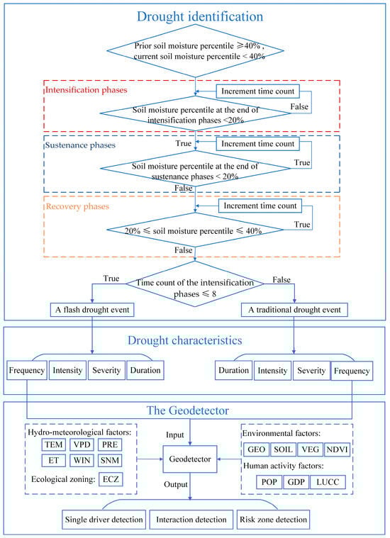 The remaining modules include interaction detection, ecological detection, and risk zone detection. In this study, the interaction detection module calculated the interaction between pairs of factors to ascertain whether the combined influence of these factors enhances or diminishes their explanatory capacity concerning flash drought and traditional drought. Meanwhile, the risk zone detection module computed risk values associated with flash drought and traditional drought within distinct ecological zones. The selected variables for analysis encompass hydro-meteorological factors such as TEM, PRE, ET, WIN, VPD, and SNM, human activity factors including POP, GDP, and LUCC, and environmental factors represented by VEG, SOIL, GEO, and NDVI. Additionally, the abovementioned factors together with ECZ served as independent variables, while the frequency of flash drought and traditional drought served as the two dependent variables for exploring spatial variations, as illustrated in Figure 7.