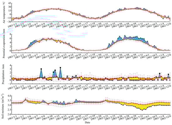 Temporal series of 1-TS in air temperature, potential evapotranspiration, precipitation, and soil moisture in Altay (47.73°N, 88.08°E). The black line with markers represents 1961–1962, and the red line denotes the 1960–2014 average. The gray vertical bars indicate mean ± standard deviation. The blue shading signifies values exceeding the mean, while the yellow shading indicates values below the mean.