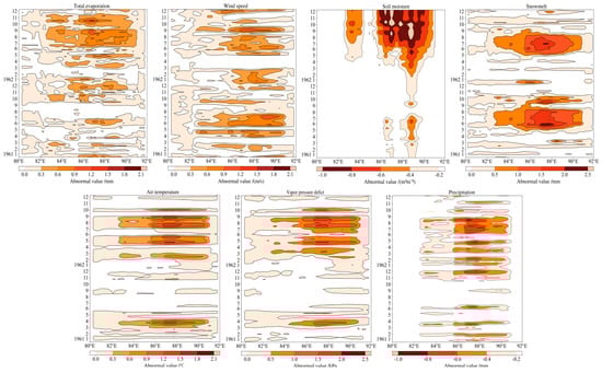 The Hovmoller diagram, illustrating climate element anomalies in Altay (45–49°N, 80–90°E), is presented in Figure 9. In this diagram, the vertical axis corresponds to the months, while the horizontal axis represents the longitude. Notably, both events were associated not only with air temperature, precipitation, and potential evapotranspiration, but also with snowmelt. At the onset of the flash drought event in 1961, there was an abnormal increase of 2.5 mm in snowmelt, leading to a recharge of soil moisture, as depicted in Figure 5. Simultaneously, an abnormal rise in air temperature (temperature anomaly >1 °C) resulted in arid atmospheric conditions (vapor pressure deficit anomaly >1.5 kPa). Additionally, wind speed also exhibited an abnormal increase. The combined impact of these factors prompted a relatively rapid transition of soil moisture from a wet state to a deficit state. However, during the spring of 1962, the absence of precipitation and the limited recharge from snowmelt caused soil moisture to hover slightly below the multi-year average. The transition of soil moisture into a deficit state occurred more gradually, driven by warming temperatures and elevated potential evapotranspiration during the spring. Subsequently, the severe soil moisture deficit during the summer and autumn (soil moisture anomaly <−1 m3m−3) was exacerbated by high-temperature anomalies, increased potential evapotranspiration anomalies, and reduced precipitation levels during the summer.