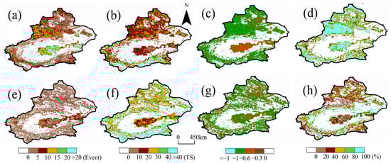 Spatial distribution for the frequency, duration, intensity, and proportions of flash drought (a–d) and traditional drought (e–h) in Xinjiang from 1960 to 2021. White areas indicate unidentified drought events.