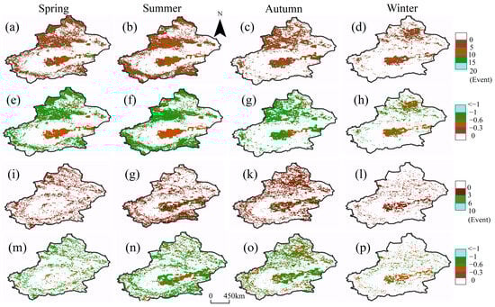 Seasonal distribution for the frequency and intensity of flash drought (a–h) and traditional drought (i–p) in Xinjiang from 1960 to 2021. White areas indicate unidentified drought events.