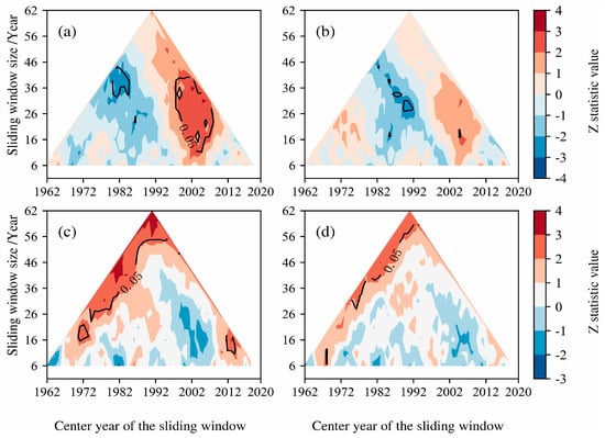 Multi-window sliding trend for the frequency and severity of flash drought (a,c) and traditional drought (b,d) in Xinjiang from 1960 to 2021. When Z is less than 0, it indicates a downward trend, whereas Z greater than 0 signifies an upward trend. Contours indicate passing the 95% confidence interval (α = 0.05).