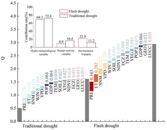 The findings reveal that precipitation exerted the most pronounced influence on the spatial variation of both flash drought (Q value: 0.343) and traditional drought (Q value: 0.15). Importantly, all factors exhibited a greater explanatory power for flash drought compared to traditional drought. Further analysis involved calculating the contribution values of the three variable types, revealing that meteorological variables had the highest contribution to both flash drought and traditional drought, accounting for 69.3% and 72.4% of the respective variations. Environmental variables exhibited a more substantial impact on flash drought (environmental variables: 21.9% > human activities: 8.8%), whereas human activities exerted a more significant influence on traditional drought (human activities: 16.4% > environmental variables: 11.2%). It is worth noting that although the contribution of human activities to flash drought may be relatively modest, its contribution to traditional drought should not be underestimated.