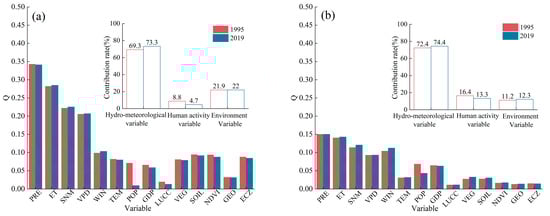 The single-factor detection module employed Q values to assess the degree to which individual drivers account for the spatial distribution of flash drought and traditional drought, as depicted in Figure 13. Our analysis focused on anthropogenic data for the years 1995 and 2019 to investigate their respective influences. Notably, the results showed no significant variations between these two years. Therefore, the detection results were present solely for the year 1995, with specific comparative findings between 1995 and 2019 detailed in the subsequent subsection.