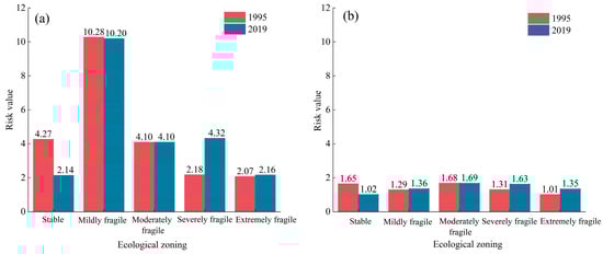 Risk value of ecological zoning associated with flash drought (a) and traditional drought (b).