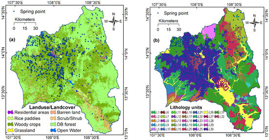 LULC refers to the activities and vegetation covering the Earth’s surface. Land use refers to human activities and the purpose for which land is utilized, i.e., agriculture, urban development, forestry, or transportation infrastructure [72]. In contrast, land cover, on the other hand, refers to the physical coverage of the Earth’s surface, i.e., vegetation, water bodies, bare soil, and artificial surfaces [73]. LULC is a crucial factor for modeling groundwater spring potential because the types of LULC areas directly influence groundwater recharge, infiltration rates, and the overall hydrological balance [74]. In this analysis, the LULC map with eight groups of the Gia Lai province (Figure 3a) was compiled using the 30 m resolution LULC dataset produced in 2020. This dataset was obtained from the Japan Aerospace Exploration Agency (JAXA) and can be accessed at www.eorc.jaxa.jp. The data retrieval was conducted on 10 March 2023.