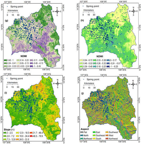 Remote sensing indices, i.e., NDVI, NDMI, NDWI, have been considered for groundwater studies [78]. NDVI provides information about the presence and vigor of vegetation, which is directly linked to groundwater availability. Higher NDVI values indicate denser vegetation cover, which suggests a higher likelihood of groundwater recharge and sustained spring activity [79]. NDMI is a spectral index that quantifies the moisture content in vegetation and soil. Thus, higher NDMI values indicate a higher soil moisture content [80], which may contribute to groundwater recharge and the presence of springs. NDWI provides an assessment of the moisture availability in the topsoil, indicating potential groundwater recharge zones and areas favorable for spring occurrence [81]. In this analysis, the computation of the remote sensing index maps, NDVI (Figure 3f), NDMI (Figure 3g), and NDWI (Figure 3h) for the Gia Lai province, was performed using the reflectance values obtained from bands 3, 4, 5, and 6 of Landsat 8 OLI imagery at a resolution of 30 m. The calculations were carried out using Equation (7) [82], Equation (8) [83], and Equation (9) [84]. The Landsat 8 OLI imagery can be accessed through the website www.earthexplorer.usgs.gov (accessed on 13 April 2023).