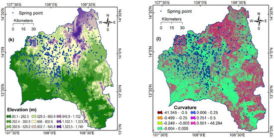 In the case of the curvature, this factor quantifies the shape of the land surface that relates to the convergent or divergent flow of water. Herein, areas with concave curvature may accumulate water [87], potentially promoting groundwater recharge and spring formation. Conversely, convex curvature indicates areas where water tends to drain or flow away [88], potentially impacting the occurrence of springs. For this study, the slope map (refer to Figure 3i), aspect map (refer to Figure 3j), elevation map (refer to Figure 3k), and curvature map (refer to Figure 3l) of the Gia Lai province were generated using an ALOS DEM (digital elevation model) at a resolution of 30 m. The ALOS DEM dataset was provided by the Earth Observation Research Center (EORC) of the Japan Aerospace Exploration Agency (JAXA) and can be accessed at www.eorc.jaxa.jp (accessed on 14 April 2023).