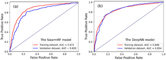 (a) ROC curve and AUC for (a) the DeepNN model and (b) SwarmRF model.