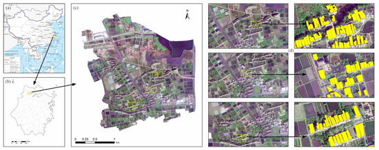 Yangdun Village: relative location in China and the shape of the homesteads. Note: (a) the location of the study area in China; (b) the location of Yangdun Village in Zhejiang Province; (c) landform of Yangdun Village, with yellow rectangular frames representing different areas; (d) homesteads with different regular shapes.