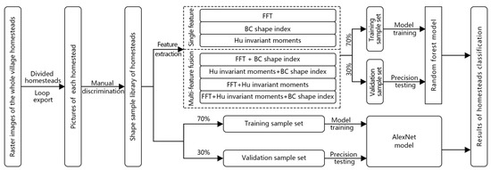 FFT, HIM, and the Boyce and Clark shape index (BCSI), along with their various combinations, were employed to extract homestead characteristics. Additionally, we utilized the random forest (RF) algorithm to oversee homestead shape classification. The deep learning method took AlexNet as an example. The specific method flow was as follows: (1) Based on OpenCV, the homesteads in Yangdun Village were divided, and each homestead was cyclically exported. (2) Combining with the shape classification library of homesteads summarized in advance, we manually distinguished and set classification numbers for each homestead and obtained sample standards with different shapes. (3) Fast Fourier transform (FFT), HIM, and the BCSI were used to extract the features of each homestead and divide them into single features and combinations of multiple features. The former refers to the use of a feature extraction algorithm, while the latter refers to the combination of more than two algorithms. (4) Based on different features, the RF method was used to carry out model training. A cross-validation method involving 100 random trials was employed to enhance reliability. In each experiment, 70% of the patches (with a total sample of 877) were randomly selected as the training set. We used the training model to classify the remaining patches, and obtained the classification results for each category of feature. (5) The classification results of the previous step model were compared with the manual classification categories, and the accuracy of the classification results of the RF method based on different feature methods was evaluated. (6) Simultaneously with steps (3)–(5), the AlexNet model based on deep learning was established by using the sample library of homestead shapes, and 100 random experiments were also carried out to obtain classification accuracy. (7) The optimal classification method was selected based on the accuracy evaluation results of various methods. (8) The optimal method was used to study the spatiotemporal evolution characteristics of the homestead shapes in Yangdun Village. The technical route is shown in Figure 2.