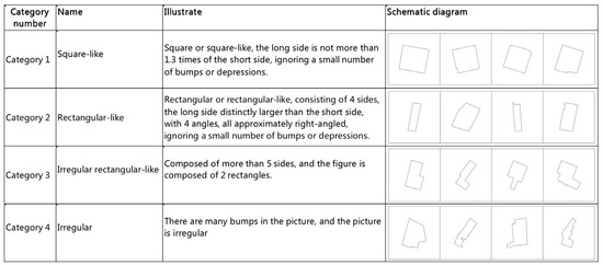 Based on the analysis of the homesteads in Yangdun Village in 2010, it was found that they had different sizes and shapes and could be classified into four categories. The specific description and diagram are shown in Figure 3.