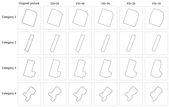 Fast Fourier transform (FFT) is simple and efficient, and it is one of the common methods to extract the boundary contour of an object [26,27]. Therefore, this study attempted to employ this method for the identification and classification of homestead boundaries. The difficulty was in how to select an appropriate descriptor. If the value is too large, the recognition efficiency will be reduced, and if it is too small, the features will be lost, and the accuracy of boundary extraction will be affected. Using the equal interval method, multiple tests were conducted on the four homestead categories. As shown in Figure 4, the first column represents four types of original homesteads, and the next five columns are the recognition results of descriptors with values of 50, 40, 30, 20, and 10. Comparative analysis revealed that setting the descriptor to 40 struck a balance between preserving feature integrity and maintaining recognition efficiency.