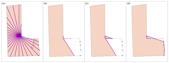 If there are multiple feature points between a ray and the border of the parcels, which one should be selected as the optimal feature point? As shown in Figure 6a, rays L1, L2, L3, and L4 all have three intersections with the boundary, namely, the internal intersection, central intersection, and external intersection from inside to outside. The three selection effects are shown in Figure 6b–d. After comparison, we found that the external feature points were closest to the shape of the original homesteads. Therefore, the feature point farthest from the centroid was defined as the optimal choice.