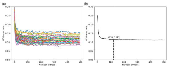 When utilizing the RF algorithm for homestead classification, two crucial parameters need consideration, namely the number of randomly extracted feature quantities in the decision tree and the number of decision trees (Ntrees). With the help of results in relevant industry research and actual homestead data tests, the number of feature quantities was the square root of feature quantities [41]. Determination of the parameter Ntrees was closely related to an out-of-bag (OOB) error. When Ntrees iterated to a certain value, the OOB error was insensitive to the change in Ntrees [42]. To avoid the contingency caused by a single test set, 50 random simulation experiments were conducted to mitigate errors (with Ntrees values ranging from 1 to 500). As shown in Figure 7a, each experiment generated a curve, and it was not easy to find the decision tree threshold from Figure 7a, resulting in a statistical chart displaying the average values, as illustrated in Figure 7b. It was observed that once Ntrees reached 120, the OOB error stabilized. Consequently, this value was chosen to optimize the model’s processing time, and the default values were selected for other parameters.