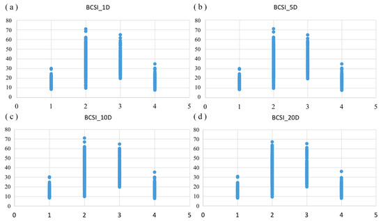 Relationship between the BCSI and shape classification of homesteads. Note: (a) diagram shows a ray emitted at 1-degree intervals; (b) diagram shows a ray emitted at 5-degree intervals; (c) diagram shows a ray emitted at 10-degree intervals; (d) diagram shows a ray emitted at 20-degree intervals. The abscissa is the category, and the ordinate is the value of the BCSI.