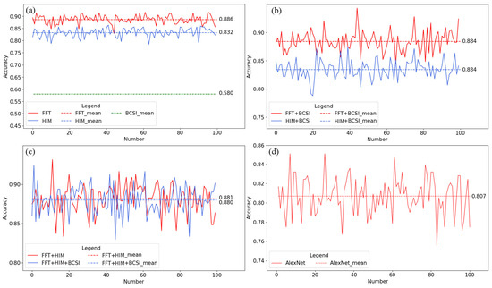 Accuracy distribution of 100 random experiments. Note: (a) accuracy rate of FFT, Hu; (b) accuracy rate of FFT + BCSI, Hu + BCSI; (c) accuracy rate of FFT + Hu, FFT + Hu + BCSI; (d) accuracy rate of AlexNet.
