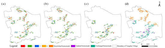 Figure 11a–c illustrate the spatial distribution of homestead shapes in Yangdun Village in 2010, 2015, and 2020, respectively. Figure 11d shows the changes in the homesteads over the past 10 years, revealing that homesteads of diverse shapes were interspersed throughout the village. Among the four shape categories, rectangular-like homesteads predominantly manifested in clustered formations, with fewer instances of isolation. Between 2010 and 2015, the number of square homesteads in the northern region of Yangdun Village was approximately twice that in the southern region. The majority of the homesteads featuring irregular graphics were solitary, and instances of two irregular homesteads positioned adjacent to one another were rare. Furthermore, the southern villages in Yangdun Village were characterized by a prevalence of rectangular-like homesteads along their borders, with square-like homesteads comprising a minimal proportion.