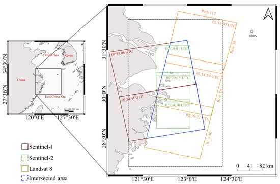 Location of the studied region shows the boundaries of Sentinel−1 (brown rectangles), Sentinel−2 (green dashed rectangles), and Landsat 8 (yellow rectangles) images. The blue−colored box indicates the intersection area of Landsat 8 and Sentinel−1 images. The black−dashed rectangle indicates the area used for visualizing the sea surface wind and surface current circumstances. Black circle indicates the location of Ieodo Ocean Research Station (IORS).