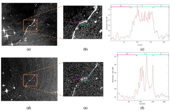 Macroalgae patches in (a) co−polarized VV (dB), and (d) cross−polarized VH (dB) images. Cross sections (red line) in images (b,e) represent the backscatter value (dB) of pixels in images (c,f). White circle = macroalgae patch, pink and blue color = water pixels, and cyan color = macroalgae pixels.