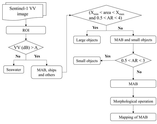 A binary image was created through thresholding which includes the MAB, ships, and some clutter areas. Among these binarized objects, non−target objects (ship and clutter features) were filtered out in two steps. Generally, objects belonging to ships occupy a larger area than the objects generated from clutter pixels and the aspect ratio, which measures the object’s footprint in a ratio of length to width [] and is also different in comparison with the clutter object. Moreover, some features belonging to ships and macroalgae can be occupied by the same size. However, the aspect ratio of ships and macroalgae is different as ships appear as a cross−like structure in VV (dB) polarization (due to the ship’s sidelobe). Therefore, they both have a long width and length compared to the MAB, which forms a long strand. As a result, by utilizing the aspect ratio, objects that were generated from the ship feature can be separated from the target object (MAB) and thus, based on the size and aspect ratio, large and small objects were filtered out of the binarized image.