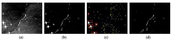 Illustration of different steps of the proposed method. (a) ROI from the Sentinel−1 VV (dB) image. (b) Result after thresholding. (c) Detecting large objects (red boxes) and small objects (yellow boxes) for removal. (d) Final MAB detection result.