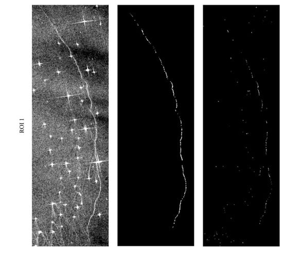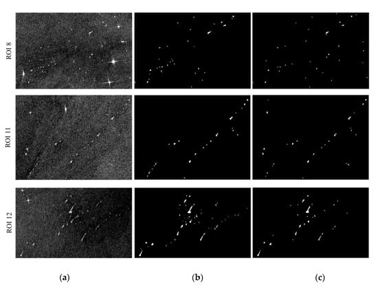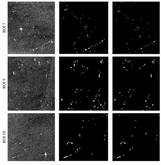 In the case of the Sentinel−1 images on 7 April 2021, the proposed detection method was applied to 12 roughly generated ROI areas, and detection results by using this method are depicted in Figure 6. The MAB in ROI areas, the reference data for related ROI areas, and the binary MAB detection results of this proposed method are shown in Figure 6a–c. In comparison to the manually extracted MAB, the average detection accuracy of the MAB with this proposed approach was 82.2%. From Figure 6c, it can be seen that features related to ships as well as the clutter features were completely removed. Afterwards, due to the morphological operation, the remaining clutter features were also eliminated, and only the object representing the macroalgae was present in the final binary image.