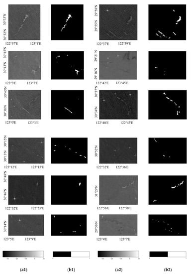 Examples of macroalgal bloom detection result from the Sentinel−1 (19 April 2021) images. (a1,a2) Sentinel−1 VV (dB) image. (b1,b2) Detection results were obtained using the proposed approach.