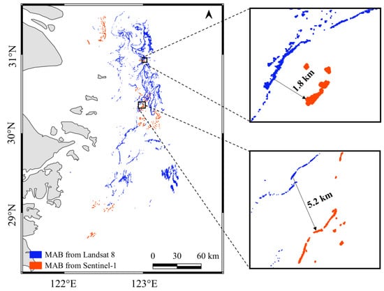 Additionally, the MAB detection results from Sentinel−1 and Landsat 8 were compared, a macroalgae patch that was visually matched based on its length and shape was identified, and the shift of the matched patch was measured by calculating its centroid displacement, which occurred by 31 h. The shift distance of the macroalgae patch was estimated based on the standard haversine distance formula, which measures the distance among two locations on the sphere [,].
